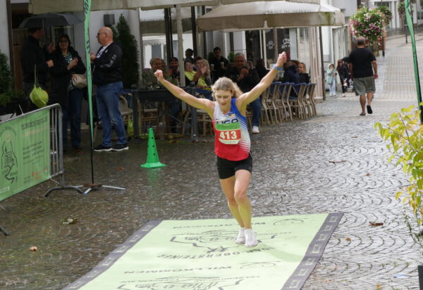 Hier nur über den Sport zu sprechen, wäre zu kurz gegriffen. Die Rahmenbedingungen waren derart einzigartig, dass es Lob von höchster Stelle gab. Doch dazu später. Die Wettervorhersage war alles andere als berauschend und Dauerregen bedeutet bei einem Treppen- und Traillauf erhöhte Verletzungsgefahr. Doch entgegen aller Vorhersagen blieb das Wetter im Rahmen und die Strecke war optimal zu laufen. Pünktlich um 11:00 Uhr fiel der Startschuss durch OB Frank Frühauf und 50 Läuferinnen und Läufer machten sich auf den Weg auf die 5,7 Kilometer lange Strecke vom Marktplatz durch die Fußgängerzone zum Wendepunkt an Gilsbachs Eck und zurück, bis es dann am Marktplatz die ersten von 350 Stufen zu erklimmen galt. Mit Martin Mayer, dem Vorjahressieger, Max Kull (Sommerbiathlon Edelweiß) und Tim Schäffling (TV Meisenheim) setzen sich gleich zu Beginn drei Junge Läufer ab, die beiden Letzteren sogar ohne Streckenerfahrung. Mayer und Schäffling waren sichtlich überrascht, dass Kull vor allem auf den Treppen und in der einzigartigen Schlosspassage seine Stärken ausspielte, um sich anschließend abzusetzen. Auf der Zielgeraden kam Mayer noch einmal heran, musste aber trotz aller Anstrengung Max Kull den Vortritt lassen, der mit einem Vorsprung von 14 Sekunden ins Ziel kam. Schäffling kam auf Gesamtplatz drei, vor dem erfahrenen Marco Gabriel und Julius Partsch. Alle Fünf blieben unter der magischen Grenzen von 30 Minuten. Schnellste Frau war Karoline Dern (LAZ Birkenfeld) vor Stefanie Lang (ITV)und Silke Stumm (TV Vollmersbach).