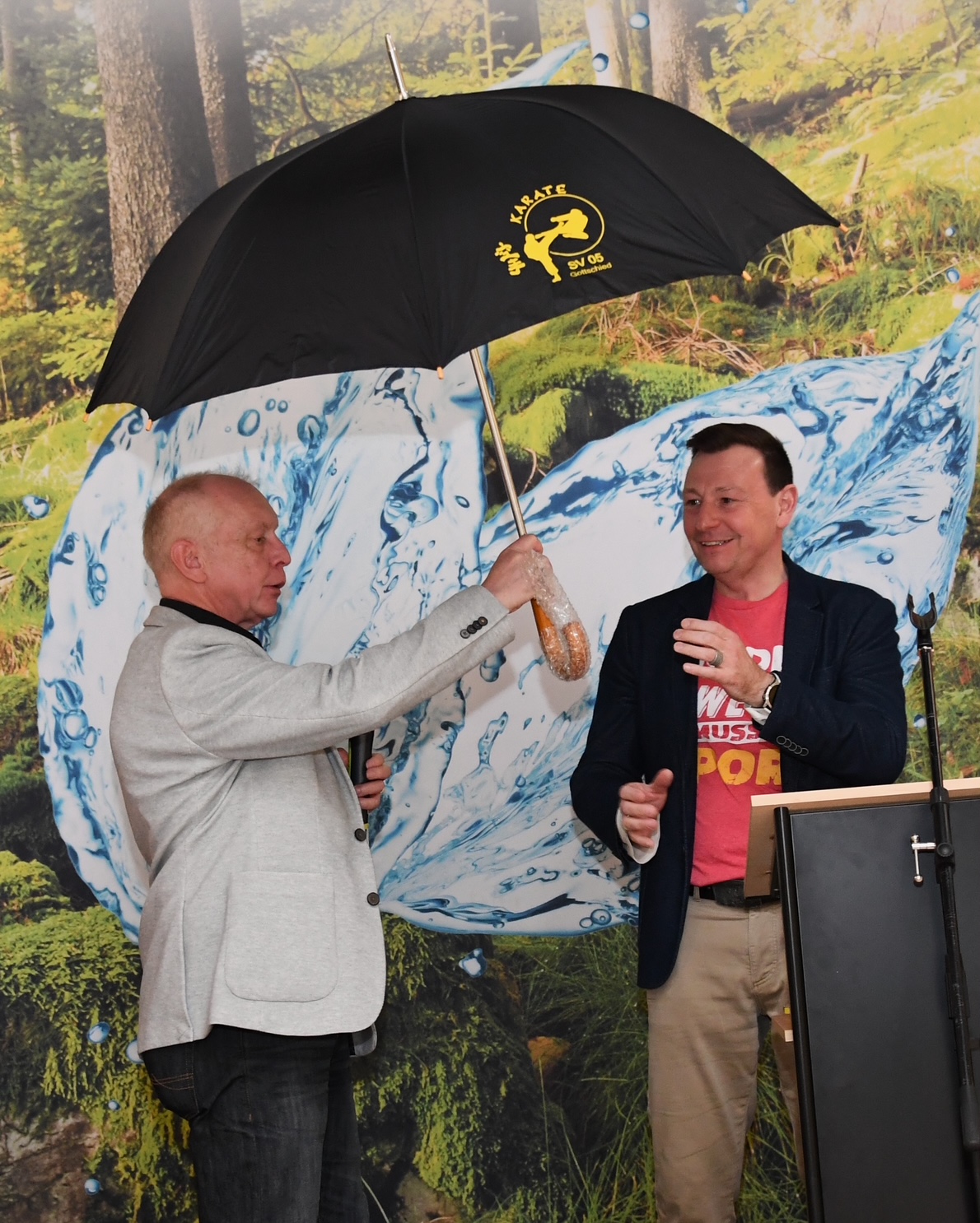 Bei der Ehrung des Sportkuratoriums wurden erstmals nicht nur Jugendliche geehrt. Vorsitzender Leonhard Stibitz überreichte dem scheidenden Messechef Mirko Arend für sein neues Arbeitsumfeld im hohen Norden (Husum) einen Schirm und ein Poloshirt. Der Schirm wegen dem dort zu erwartenden Wetter, das Shirt mit dem Logo der Deutschen Edelsteinstraße nur in Größe „M“, was aber laut Stibitz bald passen sollte, weil es ja dort keinen so leckeren Spießbraten gibt, wie in unserer Heimat.