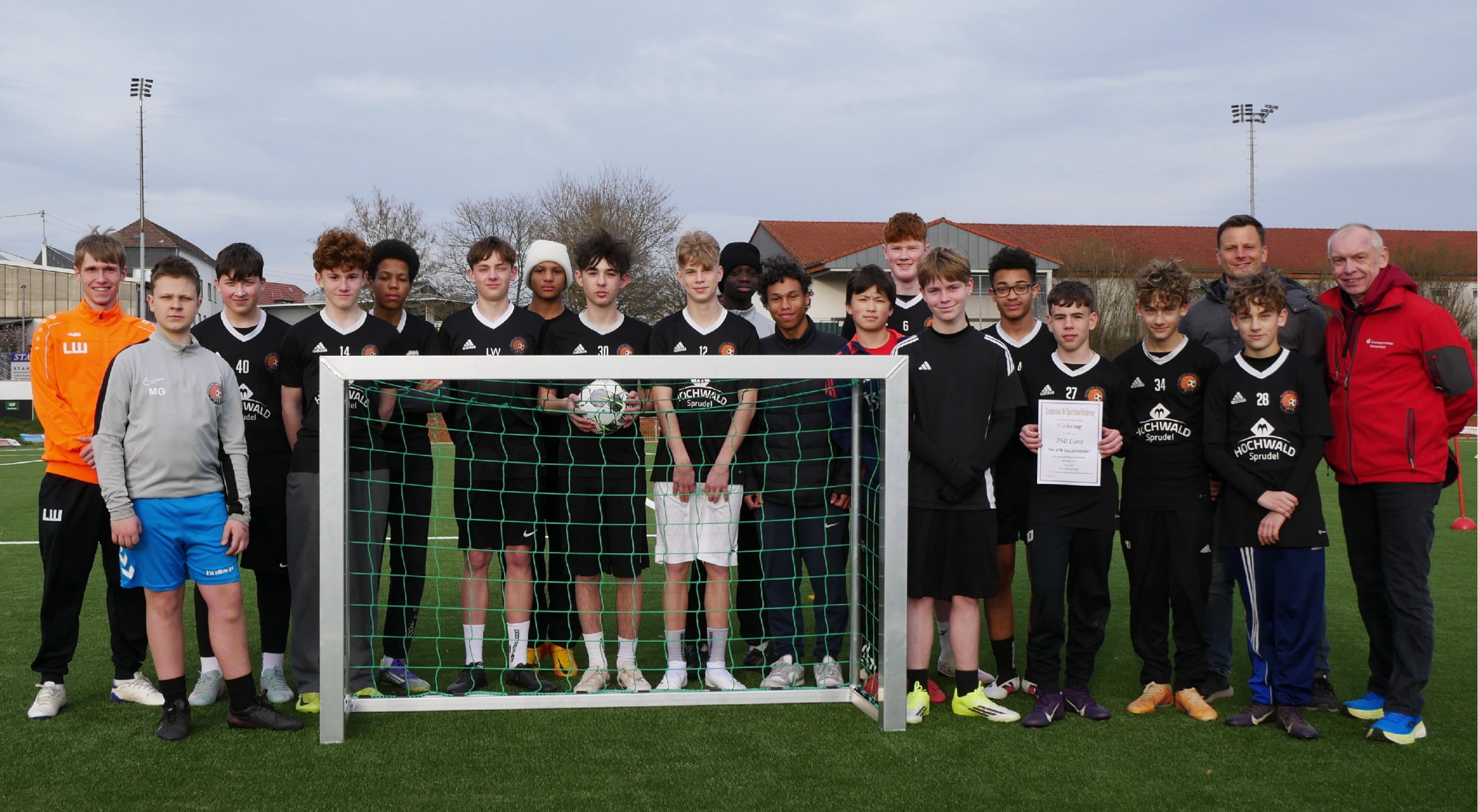 Im Baumholder wird um und an den Sportanlagen Brühlstadion und Brühlhalle fleißig gewerkelt. Was während den Arbeiten den Sportbetrieb vor Herausforderungen stellt, wird aber nach Abschluss der Sanierung und Modernisierung Möglichkeiten geben für zielgerichtetes Training, sei es für Wettkampf oder für Breitensport. Die Stadt Baumholder bietet sich als Mittelzentrum an, die Jugendfußballer der Stadt und der Umlandgemeinden im Jugendfußball-Förderverein Baumholder Westrich e.V . (JFFV) zu betreuen. Insgesamt haben ca. 170 Kids und Jugendliche dort Spaß am Fußballspiel. Abteilungsleiter Matthias Dingert berichtet nicht ohne Stolz, dass einige Teams sogar doppelt besetzt sind. Aktuell ergab sich die Notwendigkeit für den Jugendspielbetrieb neue Kleinfeld- und auch große Tore zu erwerben. Diese Anschaffung wurde nun vom Kuratorium für Sporttalentförderung mit 750 Euro unterstützt. Vorsitzender Leonhard Stibitz besuchte die C-Jugend unter Trainer Leon Werle beim Training und überbrachte den Gutschein, nicht ohne den Jungs viel Erfolg für die anstehenden Spiele zu wünschen.