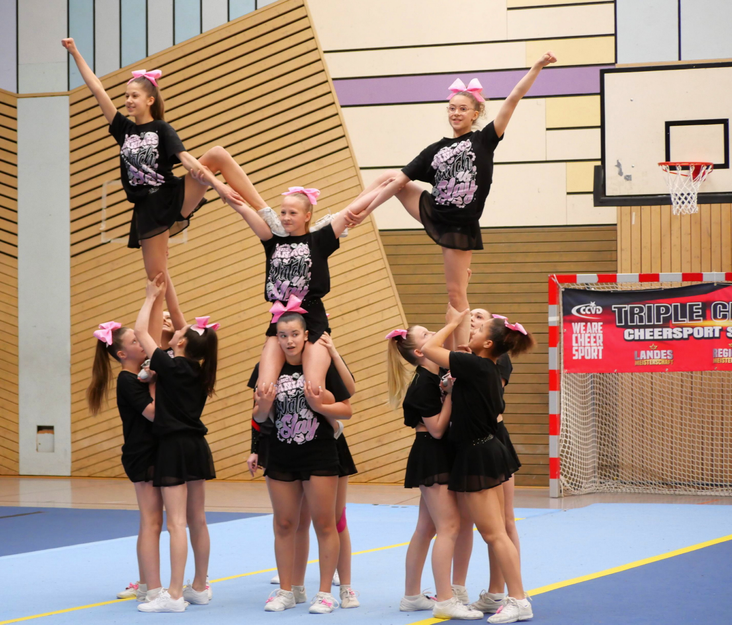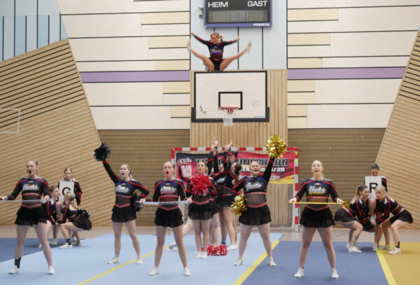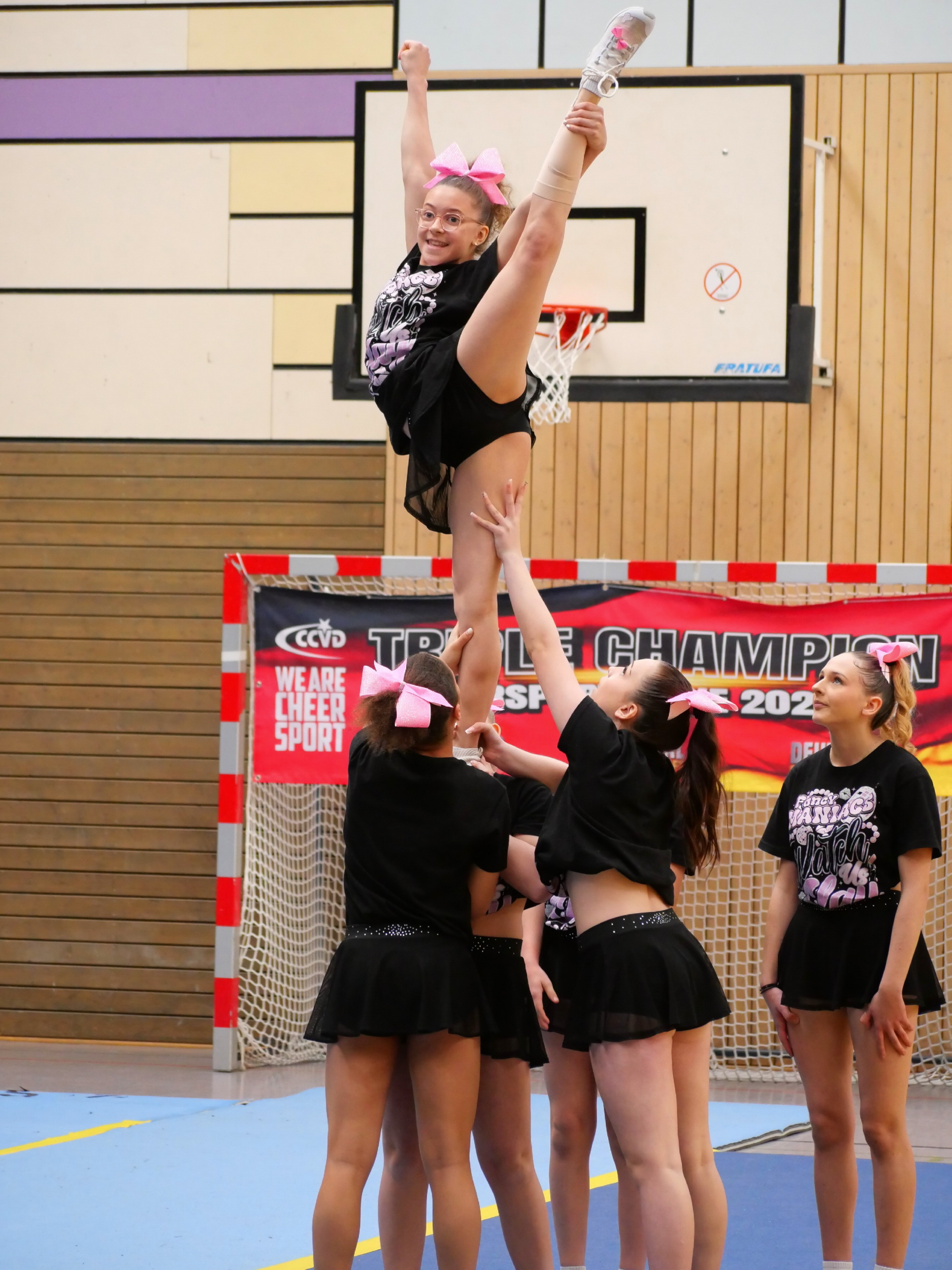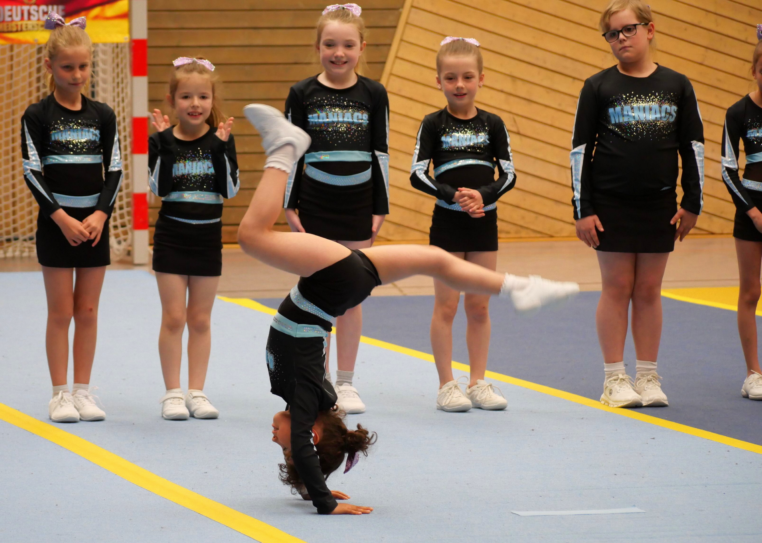 An diesem Nachmittag wurden die Fans der Sportart bestens bedient und die unbedarften Zuschauer erhielten einen wahrlich perfekten Einblick in die Welt des Cheer-Sports. In Reihenfolge der Altersgruppen standen die Teams auf der Matte. Es starteten die Mini Maniacs (ITV) gefolgt von den Mini Tsumamis (VfR) der Altersgruppe vier bis sieben Jahre. Mit dem Alter wuchsen die Schwierigkeitsgrade. Bei den Kleinsten noch Rolle vorwärts und Einbeinstand, bei den folgenden Tiny Maniacs (ITV) und Tiny Tsunamis (VfR) schon erste Pyramiden, Handstandüberschlag und immer dabei Übungen, die extreme Dehnung voraussetzen.